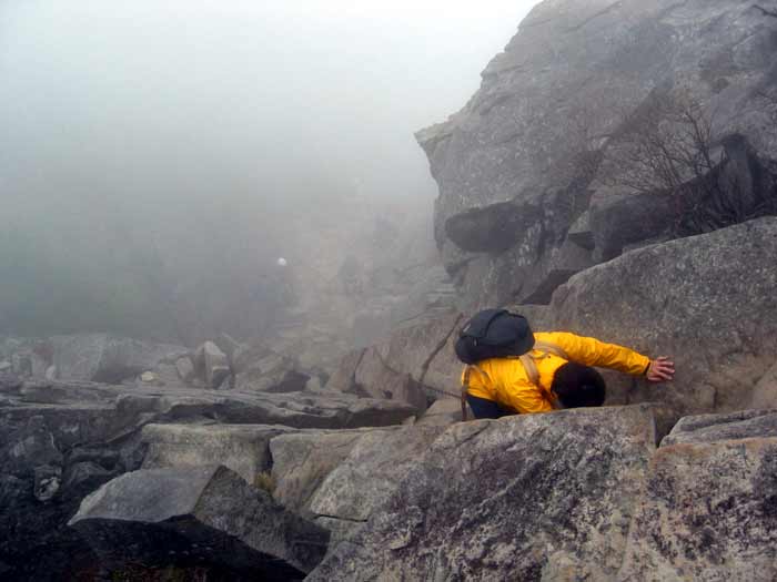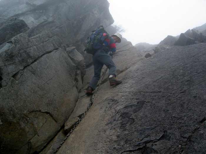 クサリ場を上から見るとこんな感じです。ガスがかかっているので高度は感じません。腕力のない人はちょっと厳しいですね。でも安心してください、巻き道がああります。(^▽^ケケケ